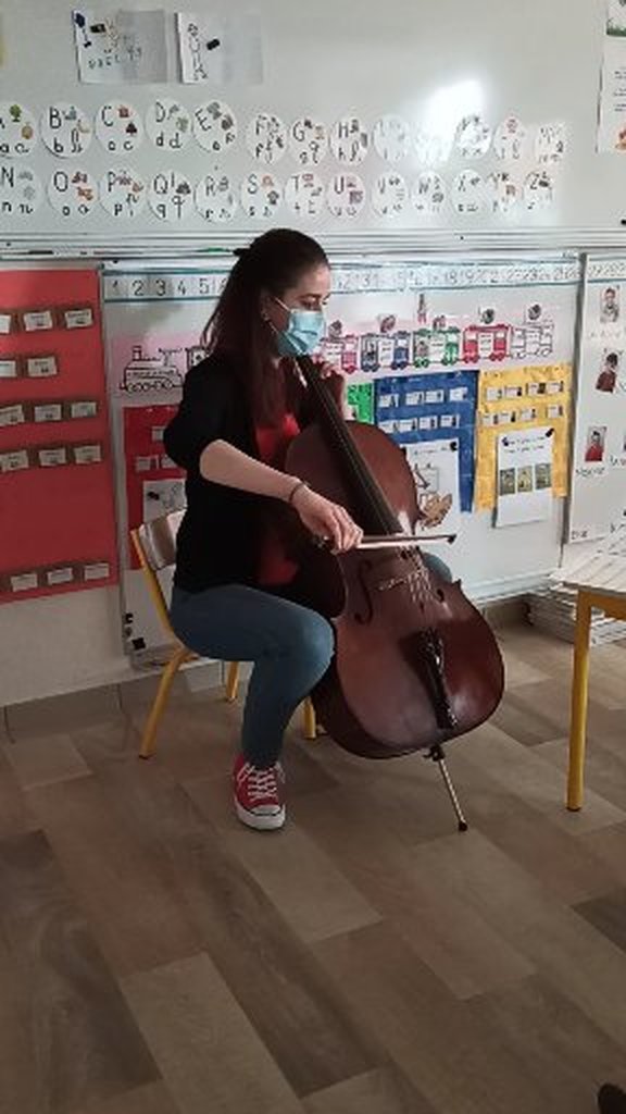Vendredi 30 avril, la maman de Cassandre est venue jouer du violoncelle dans notre classe. Les enfants qui le souhaitaient pouvaient toucher le violoncelle pendant que Anne jouait pour sentir les vibrations (« ça chatouille… »). Nous avons appris que c’est un instrument à cordes et il est en bois. On joue assis, une main tient le archet et frotte les cordes et l’autre main tient le manche. Celui-là est très vieux et très beau !!!!!