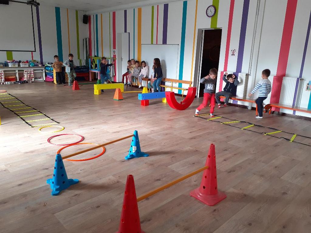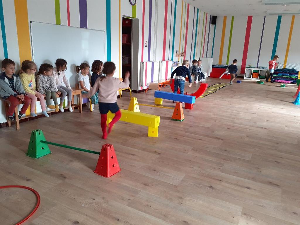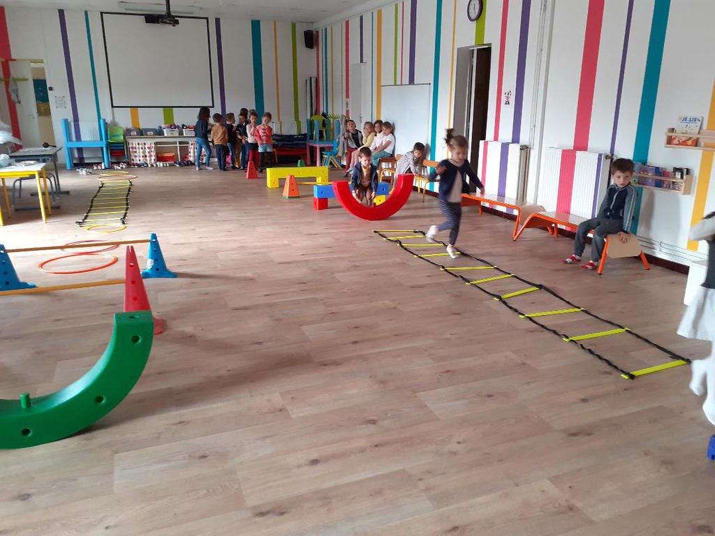 Les enfants de Grande Section débutent un cycle de sauts dans la salle de motricité. Ils adaptent leurs mouvements en fonction des obstacles qu’ils rencontrent. Ils sautent par-dessus-des haies plus ou moins hautes, plus ou moins larges. Ils effectuent une cascade de sauts dans des cerceaux ou dans une échelle de rythme posée au sol. Un merci particulier à l’APEL qui par un achat substantiel de matériel de motricité permet de varier les parcours de motricité.